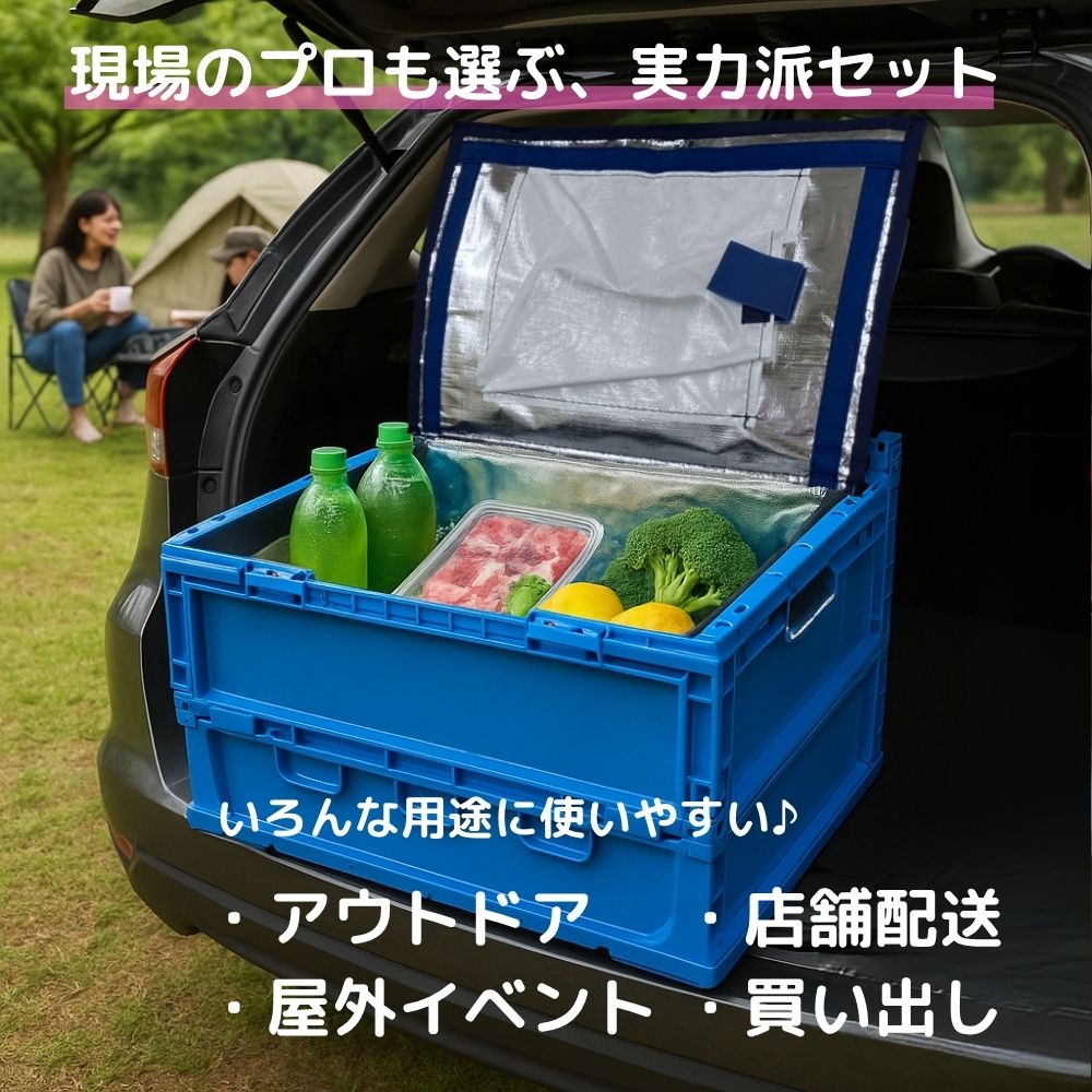 折りたたみコンテナ(50Lサイズ)に2個すっぽり収まる設計で、1つのオリコンで常温・冷蔵・冷凍・チルドなど多温度帯輸送が可能になるのが大きな特徴。