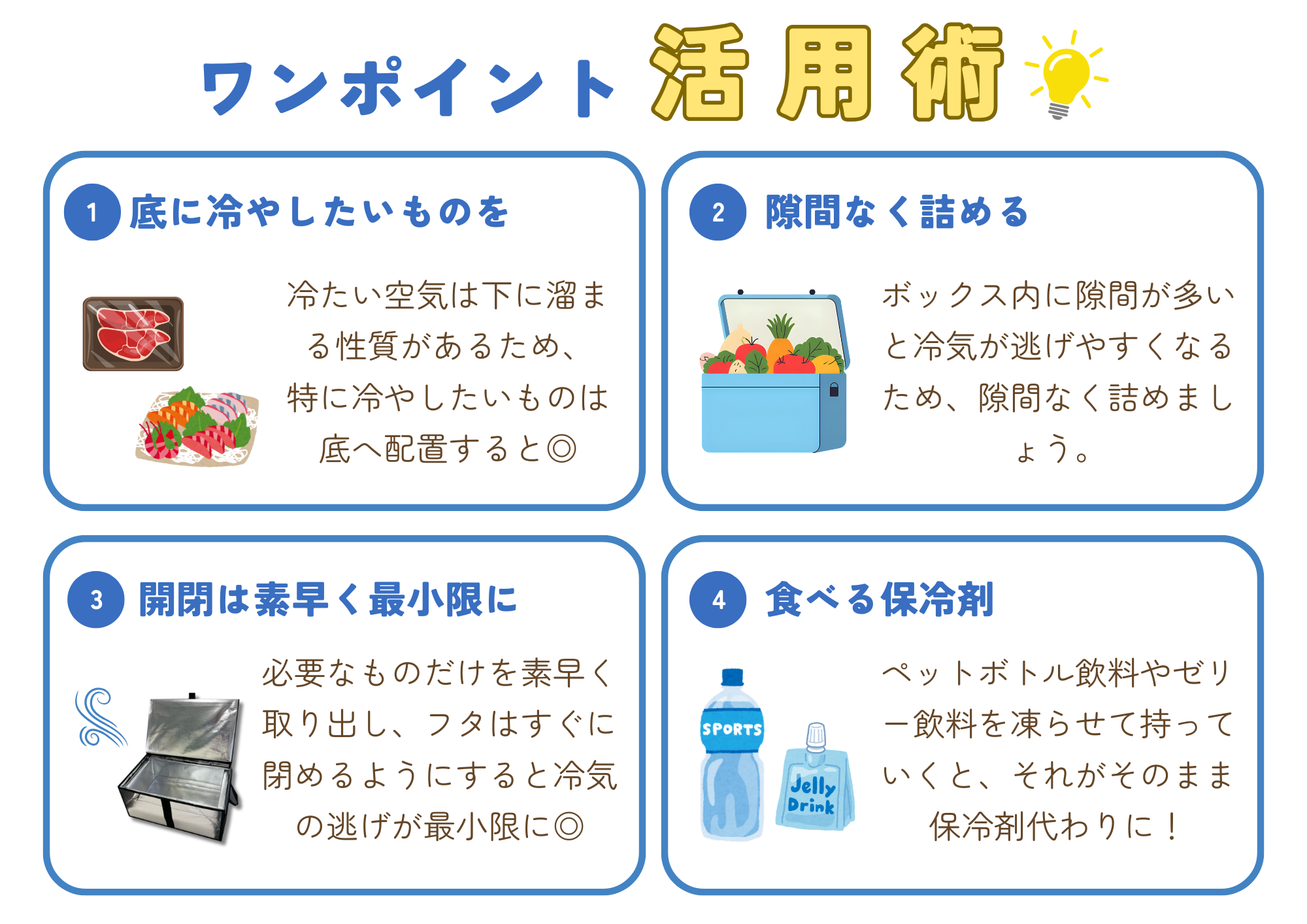 冷たい空気は下に溜まる性質があります。冷凍食品や特に冷やしたいものはボックスの底に入れると、より効率的に保冷効果が高まります。