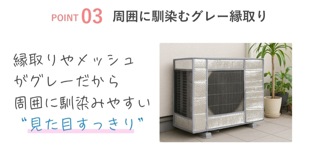 機能性だけでなく、デザイン性にもこだわりました。落ち着いたグレーの縁取りは、室外機周辺の景観を損なうことなく、様々な外壁の色や周囲の環境に自然に溶け込みます。生活感を抑え、見た目にも「すっきり」とした印象を与えます。