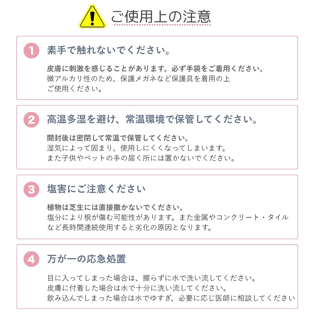 植物は芝生には直接撒かないでください。 塩分により根が傷む可能性があります。また金属やコンクリート・タイルなど長時間連続使用すると劣化の原因となります。