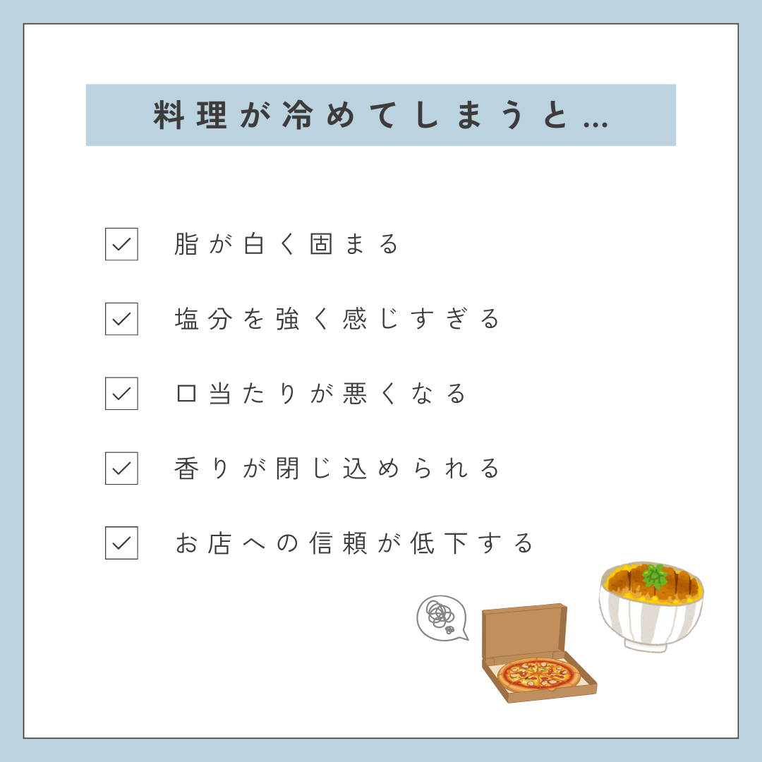 蓋を開けた瞬間にふわっと広がる湯気と、食欲をそそる香り。それこそが、お客様が心待ちにしている「プロの味」そのものです。 しかし、真冬の冷気は想像以上に手ごわく、せっかくのソースやお肉の脂をあっという間に固めてしまいます。一度冷めてしまうと、後から温め直しても、作りたてのあの感動はなかなか戻らないもの。「熱々であること」も、味付けと同じくらい大切なおもてなしの一部です。