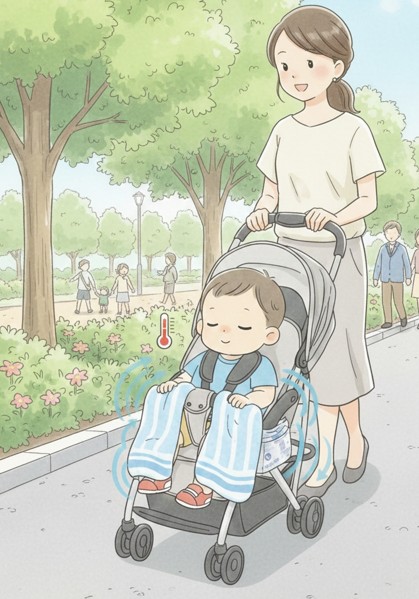 自転車の後部座席やベビーカーは、地面からの照り返しにより、大人が歩いている高さよりも+ 5℃以上高温になっていることも珍しくありません。小さな子供は体温調節機能が未発達なため、積極的な冷却が必要です。