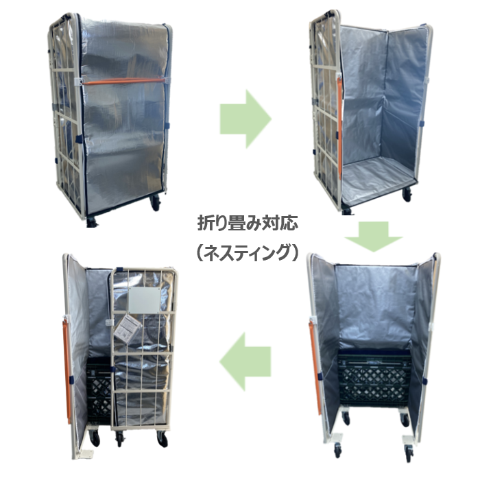 カゴ台車に被せるだけで、簡単に要冷品の保冷・保温が可能に。クリスマスケーキやおせち料理の保管用として、カゴ台車ごと温度管理できます。