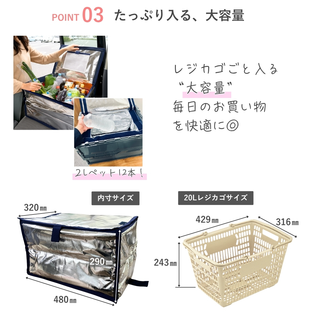 レジかごごと入る大容量サイズで毎日のお買い物にもおすすめです。