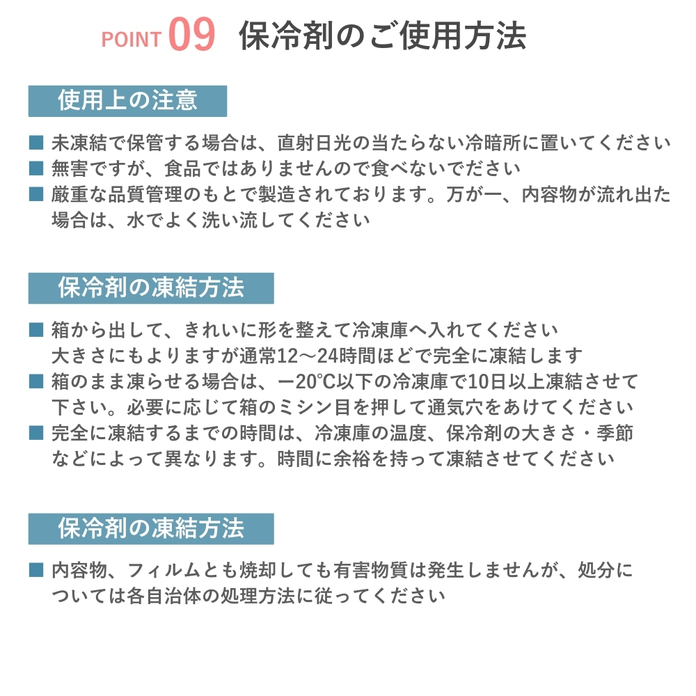 ・完全に凍結するまでの時間は、冷凍庫の温度、保冷剤の大きさ、季節などによって異なります。時間に余裕をもって凍結させてください。