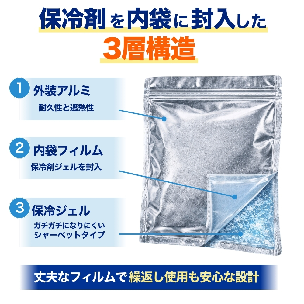外側は丈夫なアルミパウチ、内側には保冷液を封入した設計で、コンパクトながらしっかり保冷。