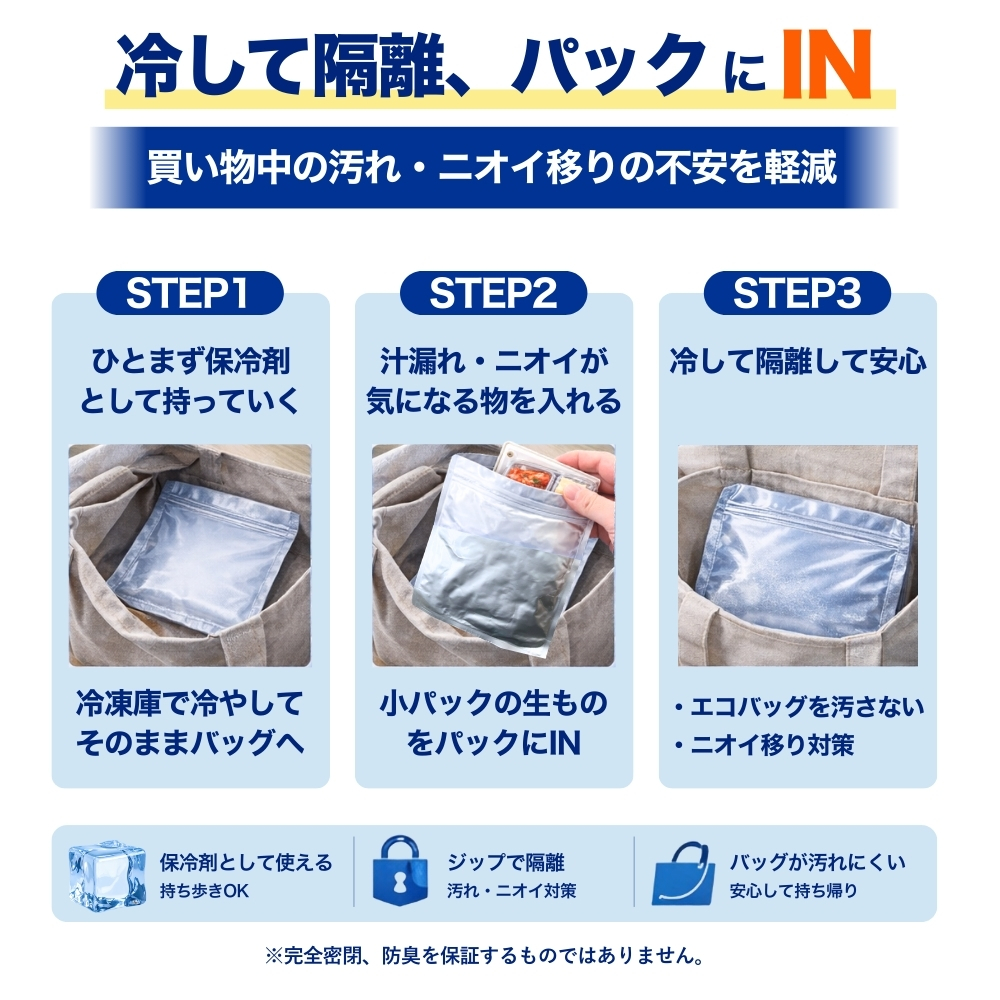 買い物中に「使うか分からないけど、とりあえず持っていく」ができるので、エコバッグの汚れ対策やにおい移り対策にも役立ちます。