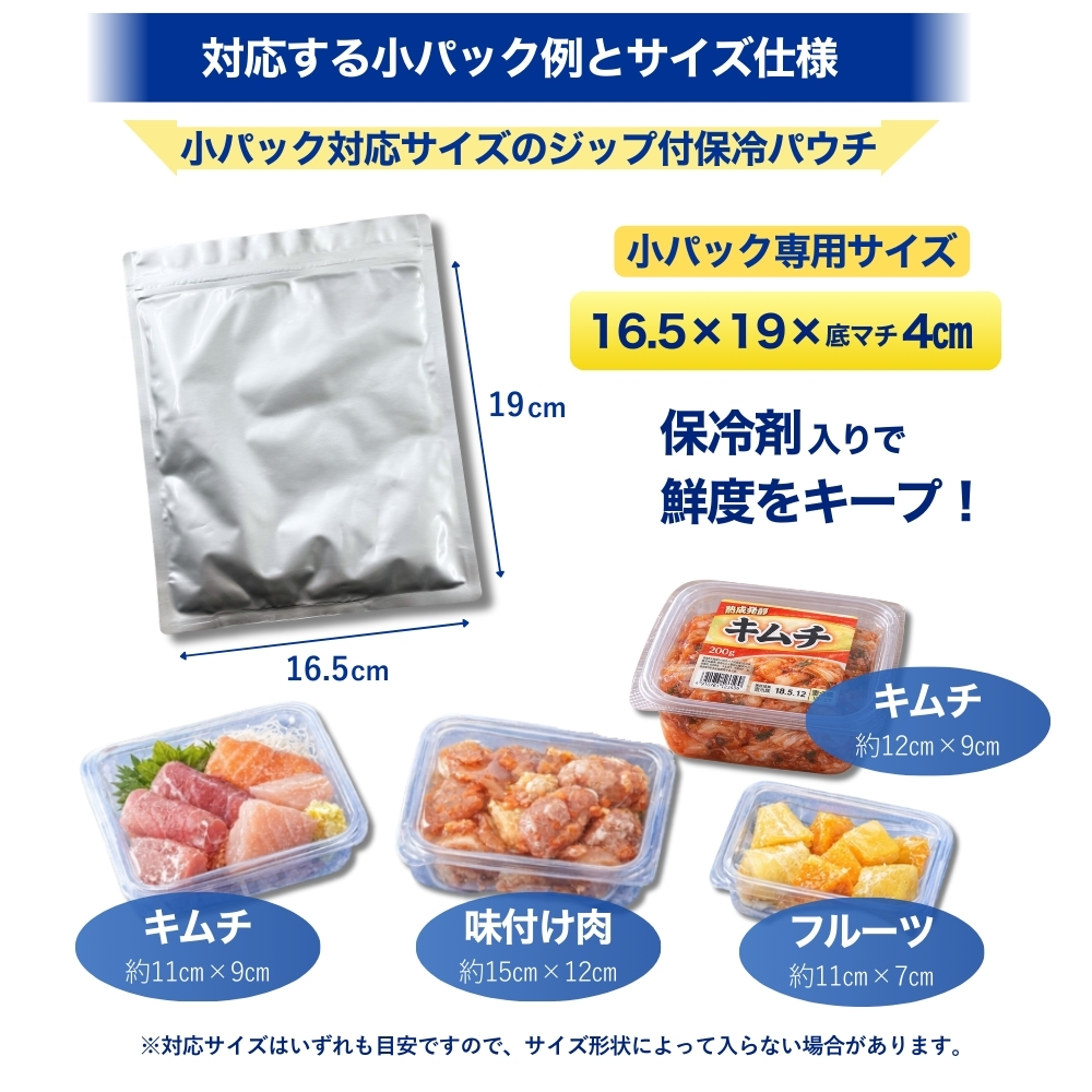小パック専用サイズ(約16.5×19×マチ4cm)で、200〜300g前後のキムチパックや小さめの生鮮食品パックにも使いやすいサイズ感です。