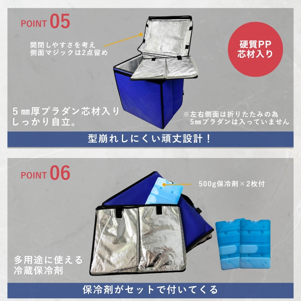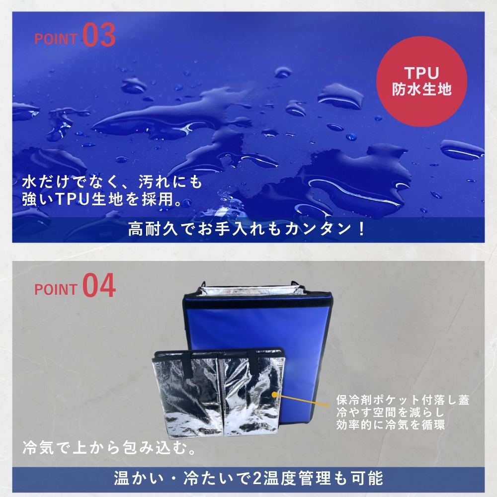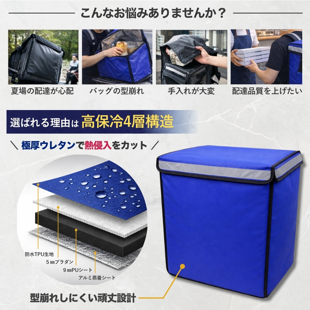 外装には水や汚れに強いTPU生地、内装にはアルミ蒸着シートを採用。さらに、5mm厚プラダンと9mm厚ポリウレタンを組み合わせたしっかりした断熱構造で、外気の影響を受けにくく、配達中の温度変化を抑えやすい設計です。