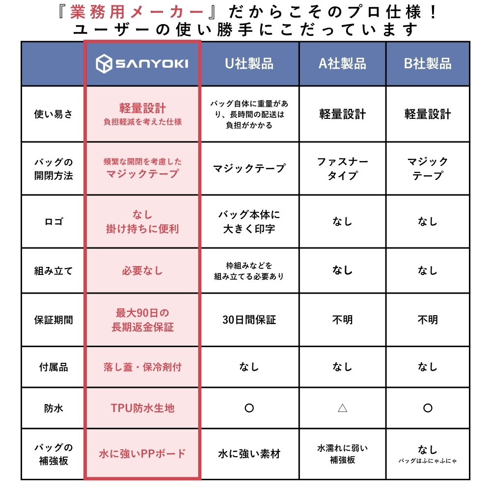 冷たい商品を、できるだけ冷たいまま届けたい。そんな現場の声に応える、高保冷仕様のデリバリーリュックです。