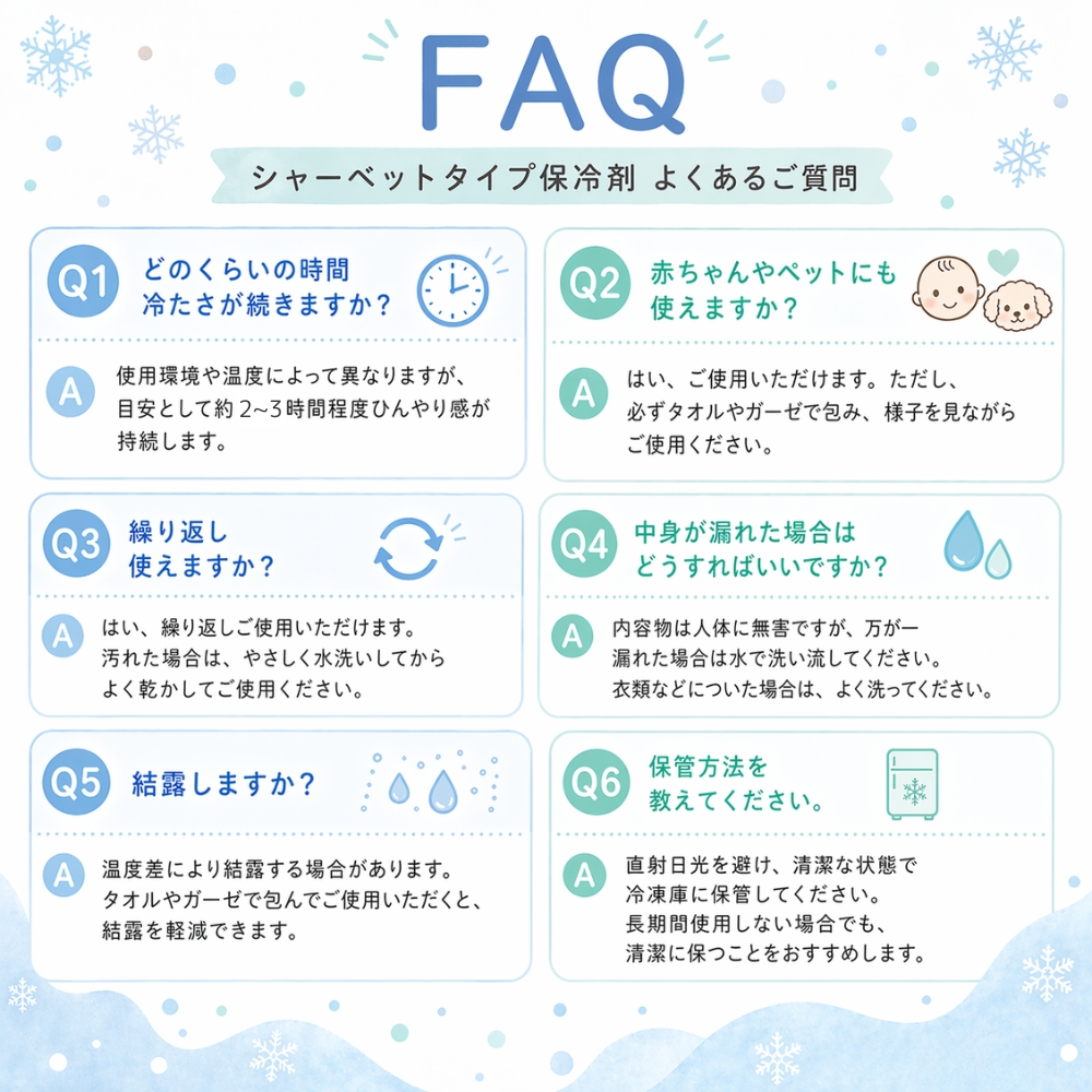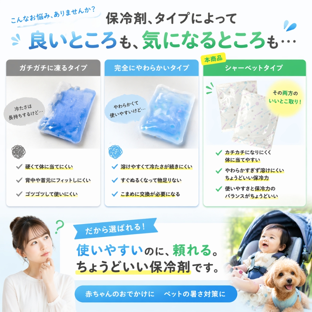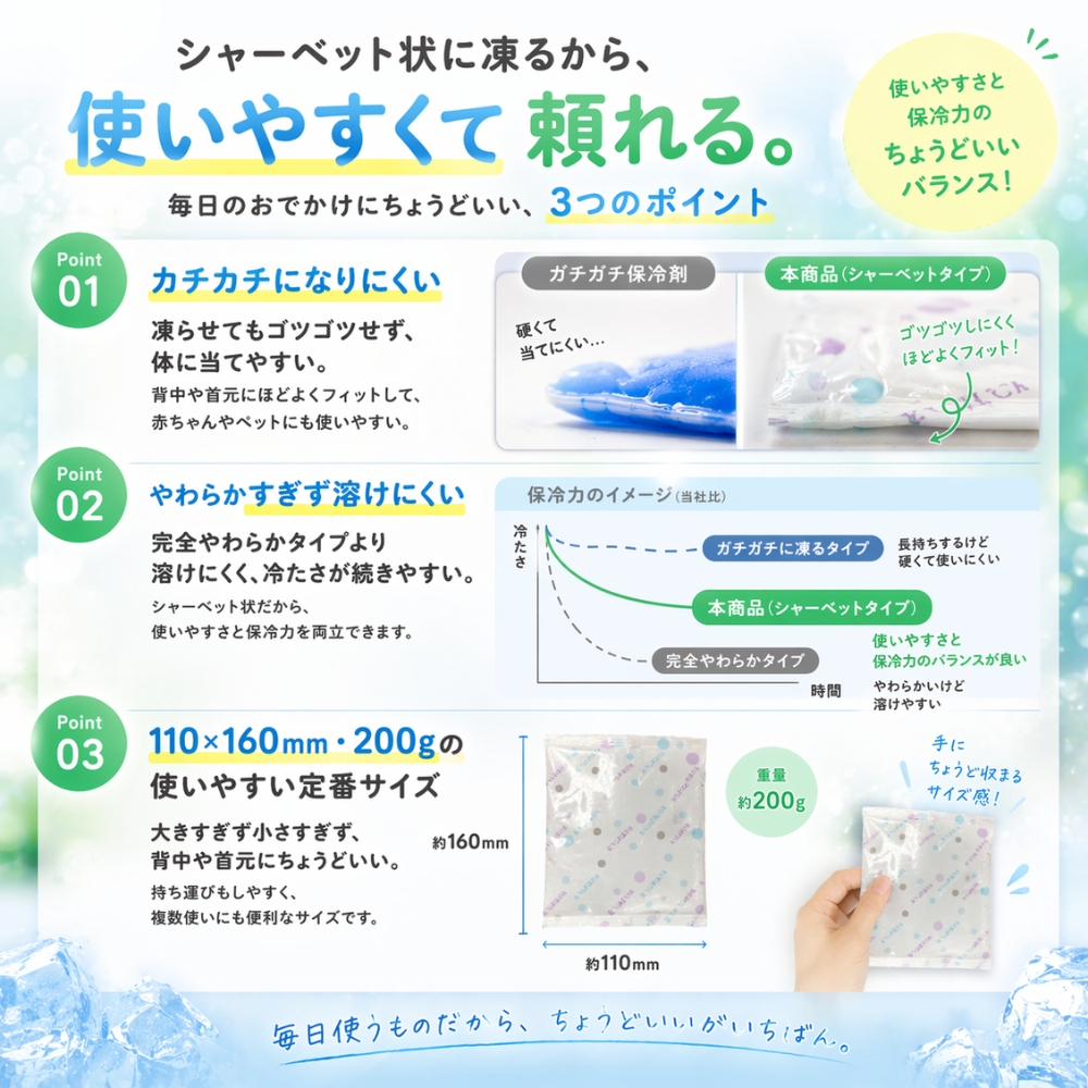 そんな両方の悩みに着目して作られたのが、使いやすさと保冷力のバランスを追求したシャーベットタイプ保冷剤です。