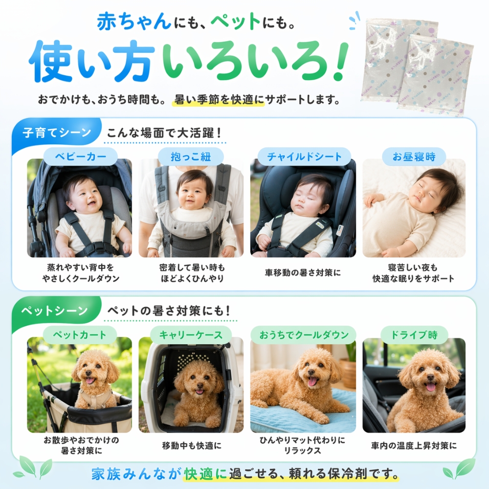 赤ちゃんやペットに使用する場合は、冷たさの感じ方に個人差がありますので、様子を見ながらご使用ください。