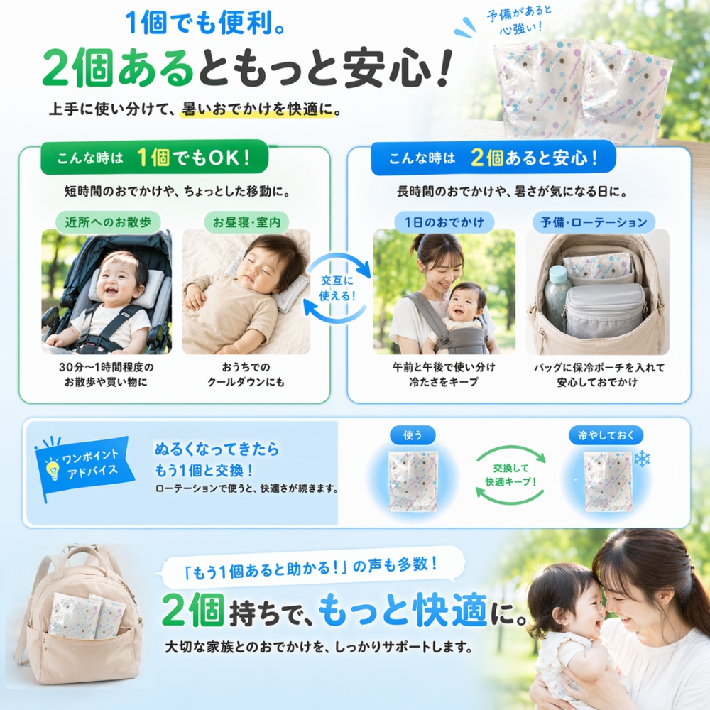 首元や頭の後ろ、背中まわりの暑さ対策に使いやすく、替え用を保冷ポーチに入れて持ち運べば、長時間のおでかけ時にも安心です。