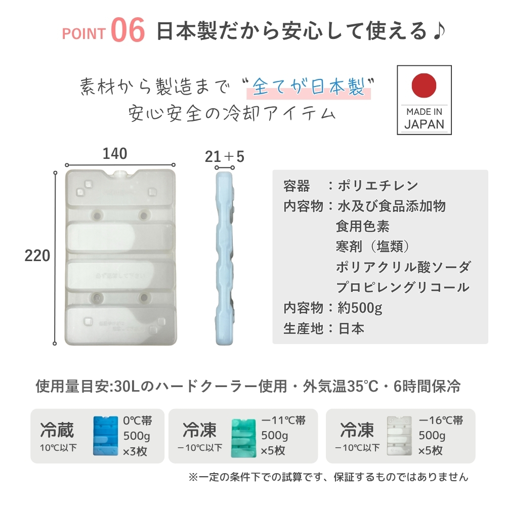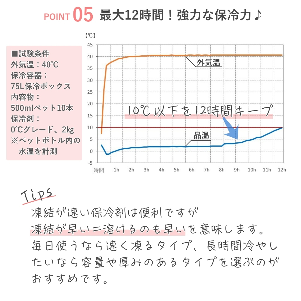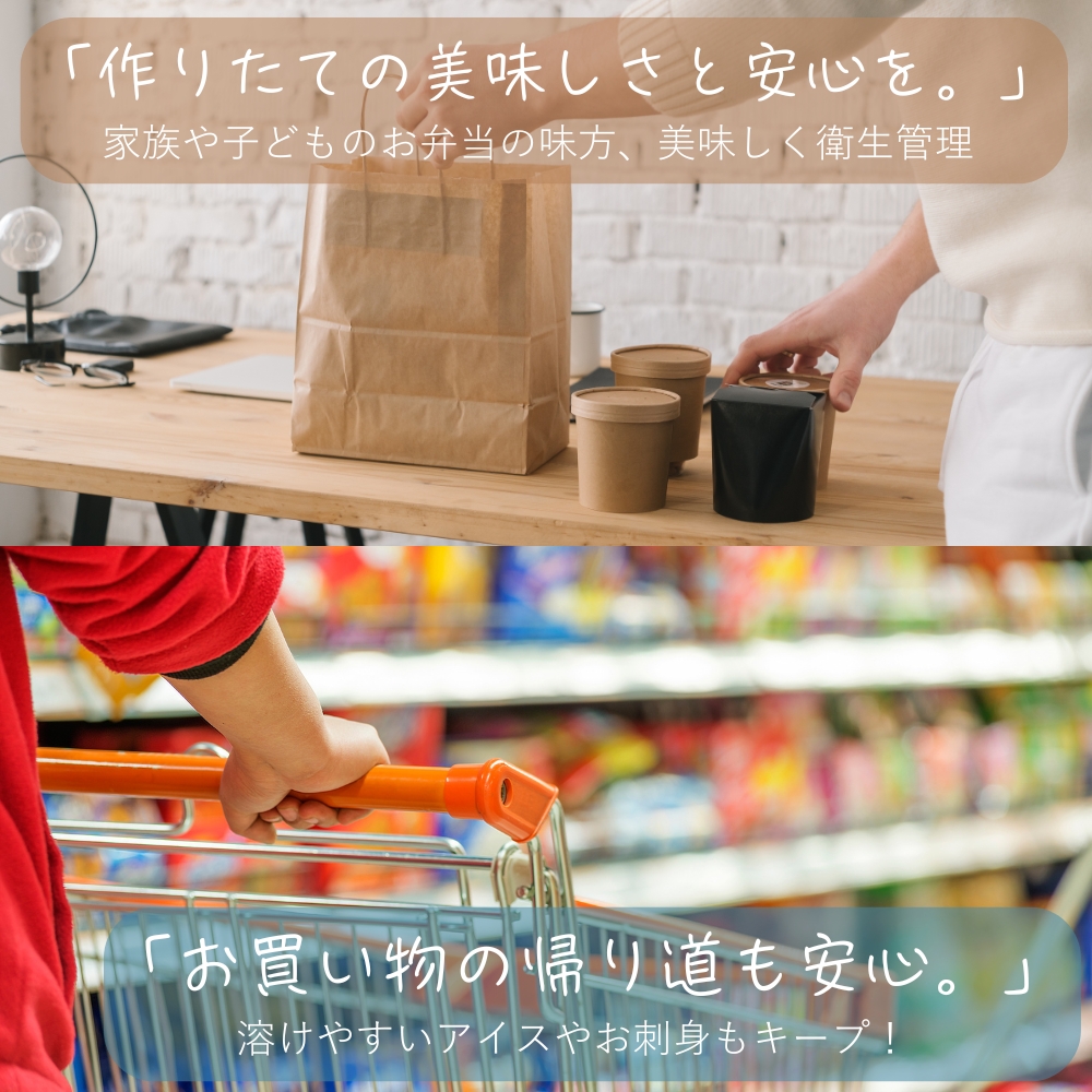 保冷ボックスと組み合わせて使用いただければ、長時間の保冷が可能となります。保冷時間と温度は、保冷容器と使用環境などの条件によって異なります。