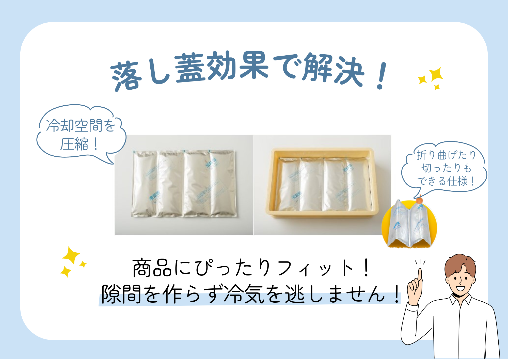 従来のゴツゴツした保冷剤は、商品との間にどうしても「隙間」ができてしまい、冷気が逃げる原因となっていました。