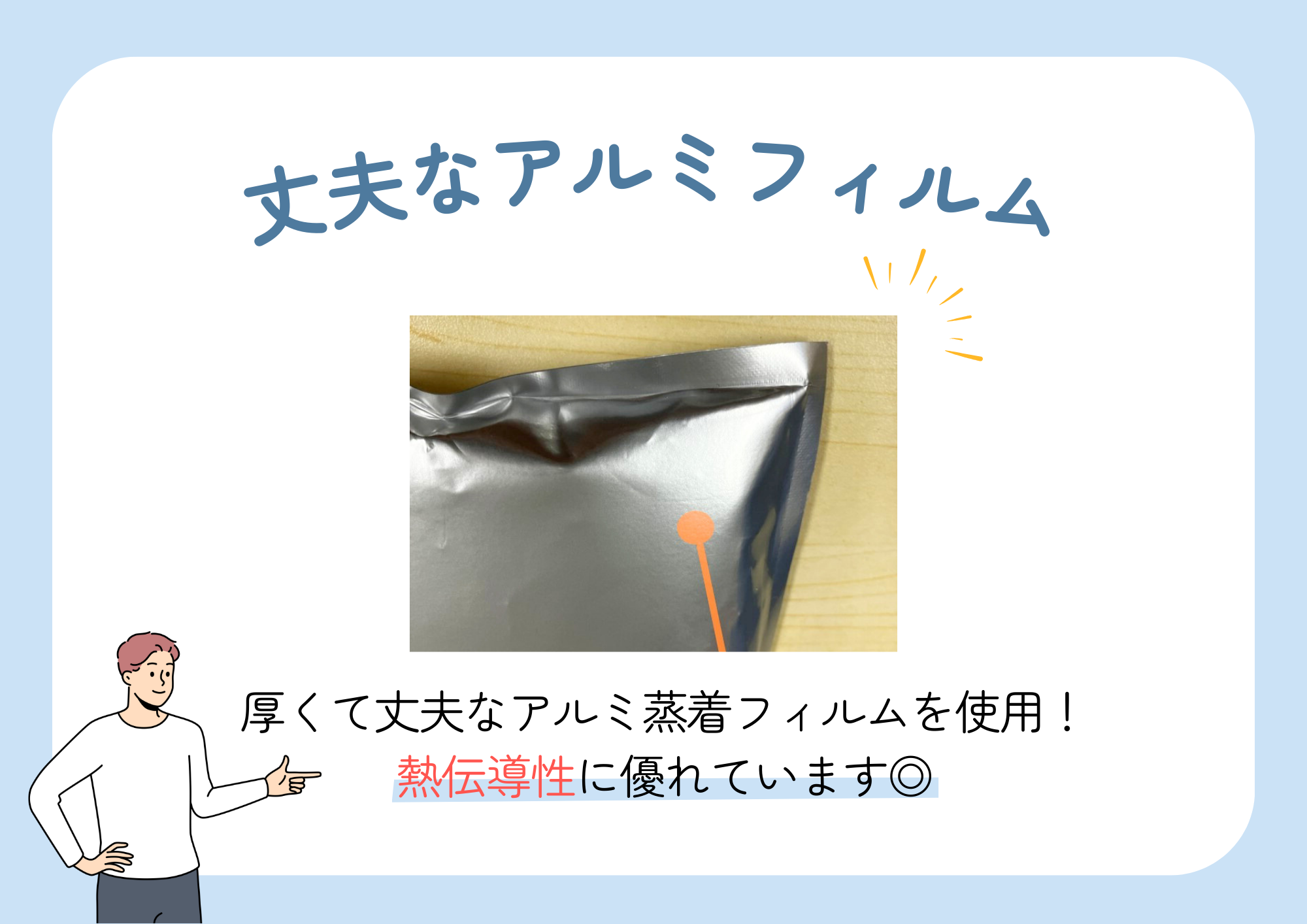 外装には強度の高いアルミフィルムを採用。実際に業務用として導入されているお客様からは、驚きの声が届いています。