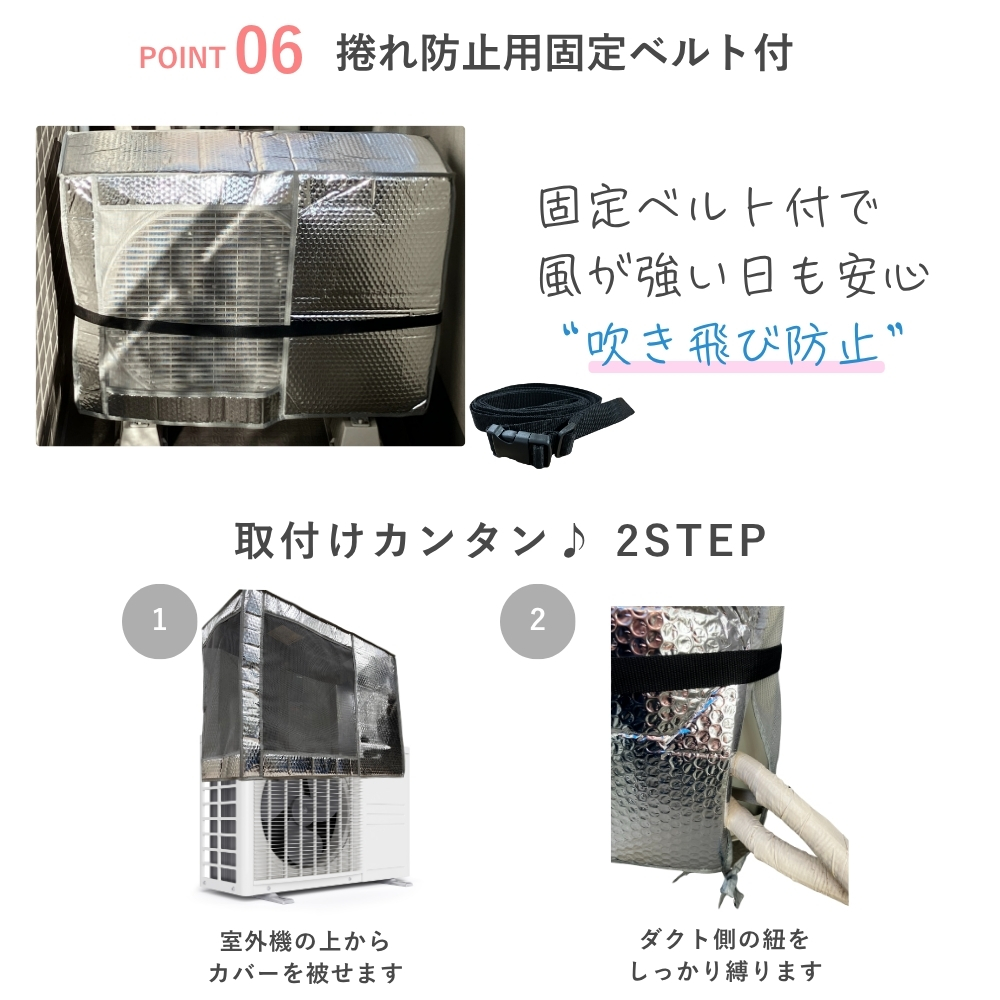 屋外に設置するものだからこそ、強風対策は必須です。付属の丈夫な固定ベルトで、カバーをしっかりと室外機に固定することができます。組み立ての手間は一切なく、誰でも簡単に設置でき、台風や強風の日でも飛ばされる心配がなく安心です。