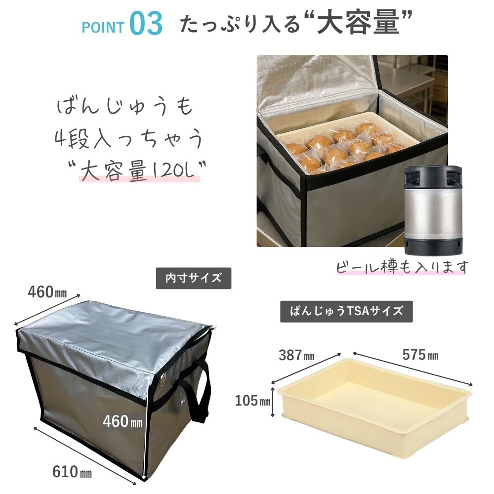 一般的なばんじゅう(※)が無理なく4段も収まるように設計されています。約120Lという大容量なので、お弁当、パン、総菜、仕込み済みの食材などの配送はもちろん、まとめて大量の商品を運ぶ際に非常に便利です。多くの商品を一度に運搬できるため、配送回数の削減や作業効率の向上に大きく貢献します。