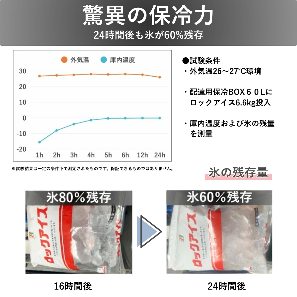 配達の成否は「温度」にあります。この60L配達用保冷ボックスは、一般的な保冷バッグとは一線を画す強力な保冷性能を誇ります。