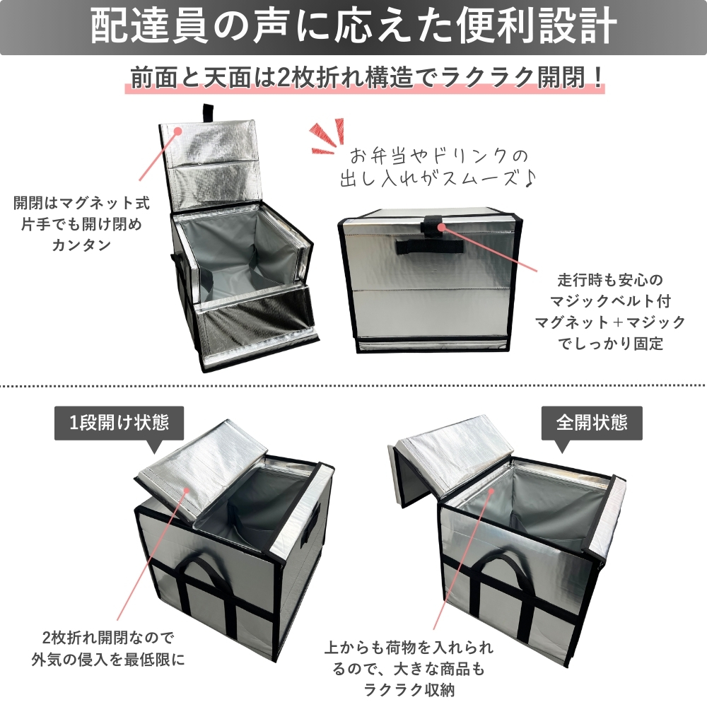 バイクでの配達では、急な走行や急ブレーキなどで中の荷物が飛び出す恐れがあります。そのため、マグネットに加え、マジックベルト付のマジックテープでさらに固定ができる二重構造を採用。走行時も安心の安全対策を施しています。