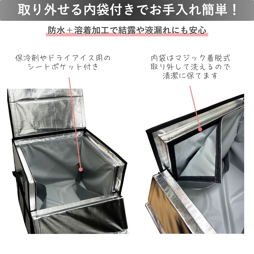 内側には保冷剤やドライアイス用のシートポケットが付いており、さらに確実な温度管理をサポートします。
