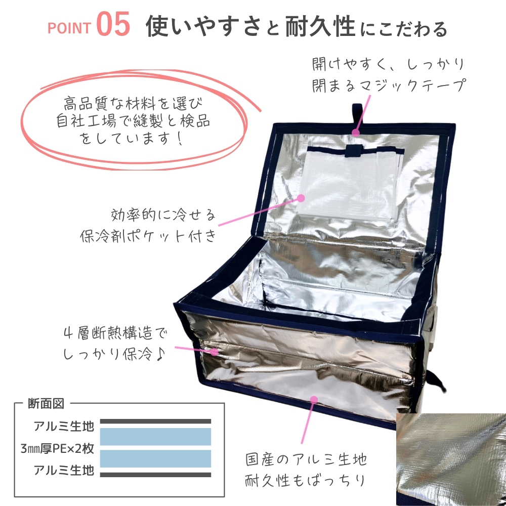 プロの現場で毎日ハードに使われてもびくともしない、マジックテープの「密着力」と「丈夫さ」。冷気を一滴も逃さずしっかり閉じ込めてくれる安心感は、家族の食卓と笑顔を守るための、何より頼もしい味方になります。100均や付録のバッグではどうしても頼りなく感じていた方も、この「本物の道具」が持つ手応えを一度知れば、もう手放せなくなるはず。