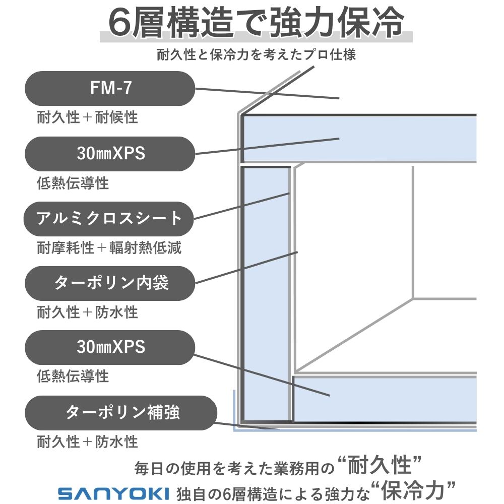 ・内装にはアルミ生地と、断熱材にXPS30mm入っており、保冷保温が可能です