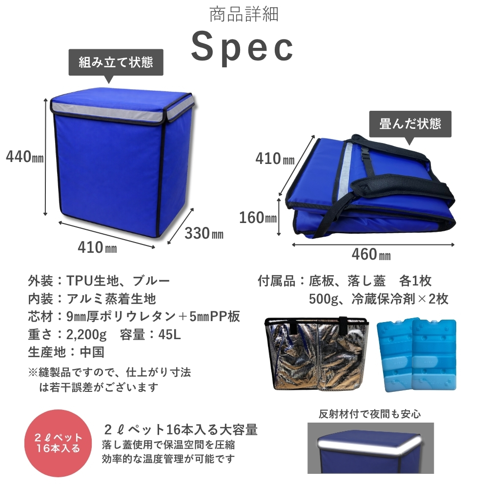 外装には水や汚れに強いTPU生地、内装にはアルミ蒸着シートを採用。さらに、5mm厚プラダンと9mm厚ポリウレタンを組み合わせたしっかりした断熱構造で、外気の影響を受けにくく、配達中の温度変化を抑えやすい設計です。