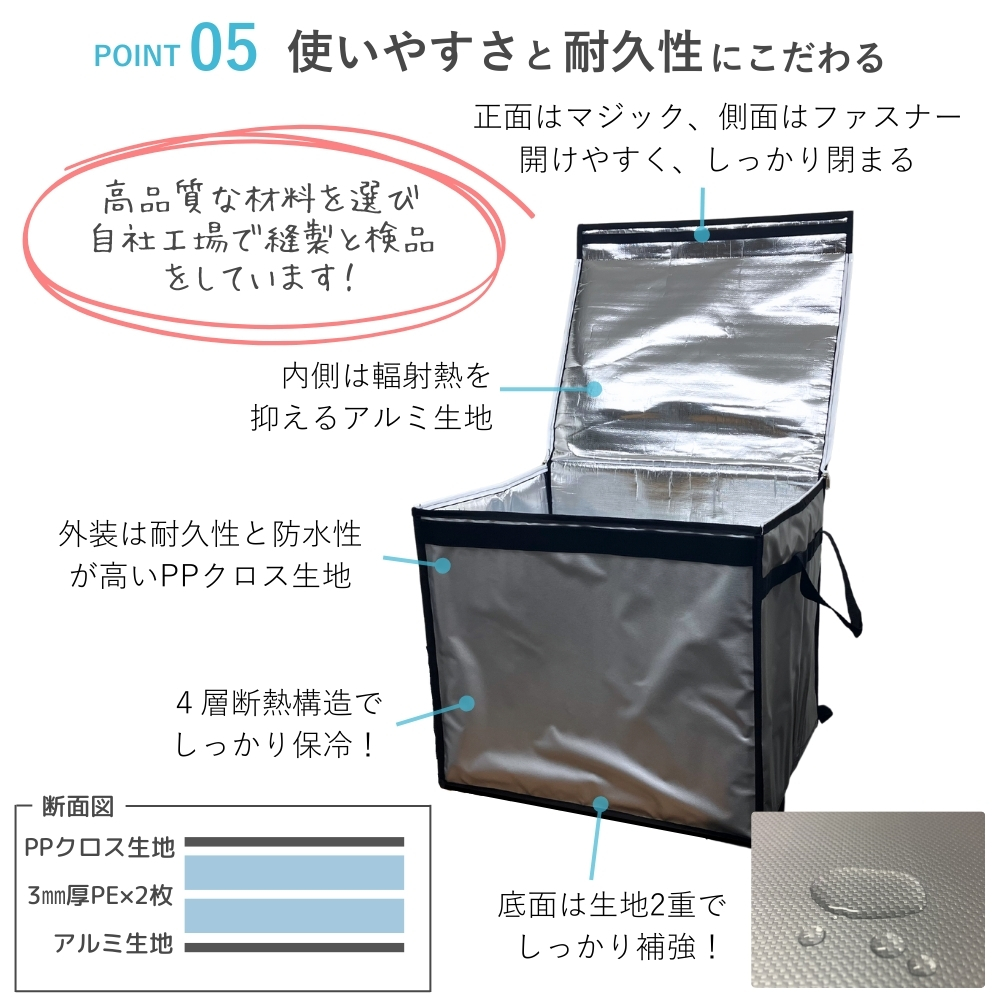 ■内装にはアルミ生地と、断熱材に3㎜発泡が2枚入っており、保冷保温が可能です。